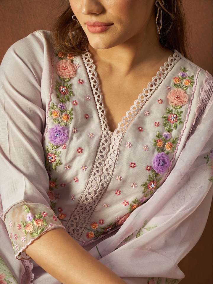 Grey, lavendar, green embroidered Kurta with Trousers with dupatta