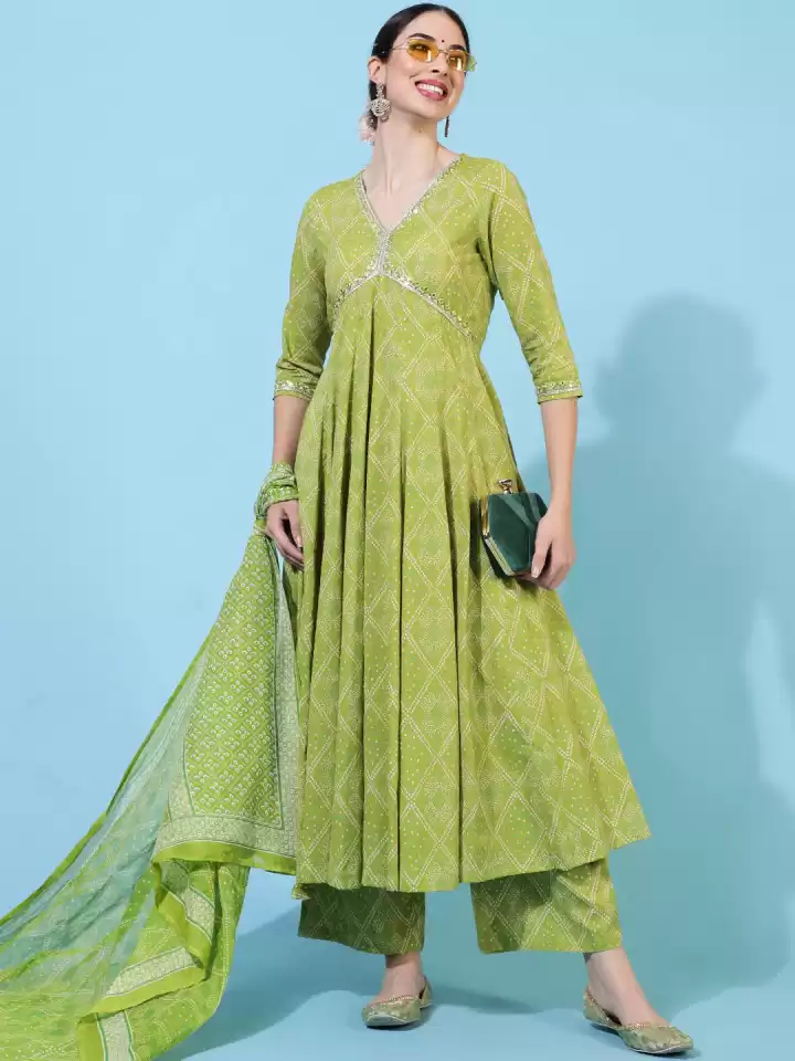 Women Bandhani Printed Empire Beads and Stones Pure Cotton Kurta with Palazzos & With Dupatta