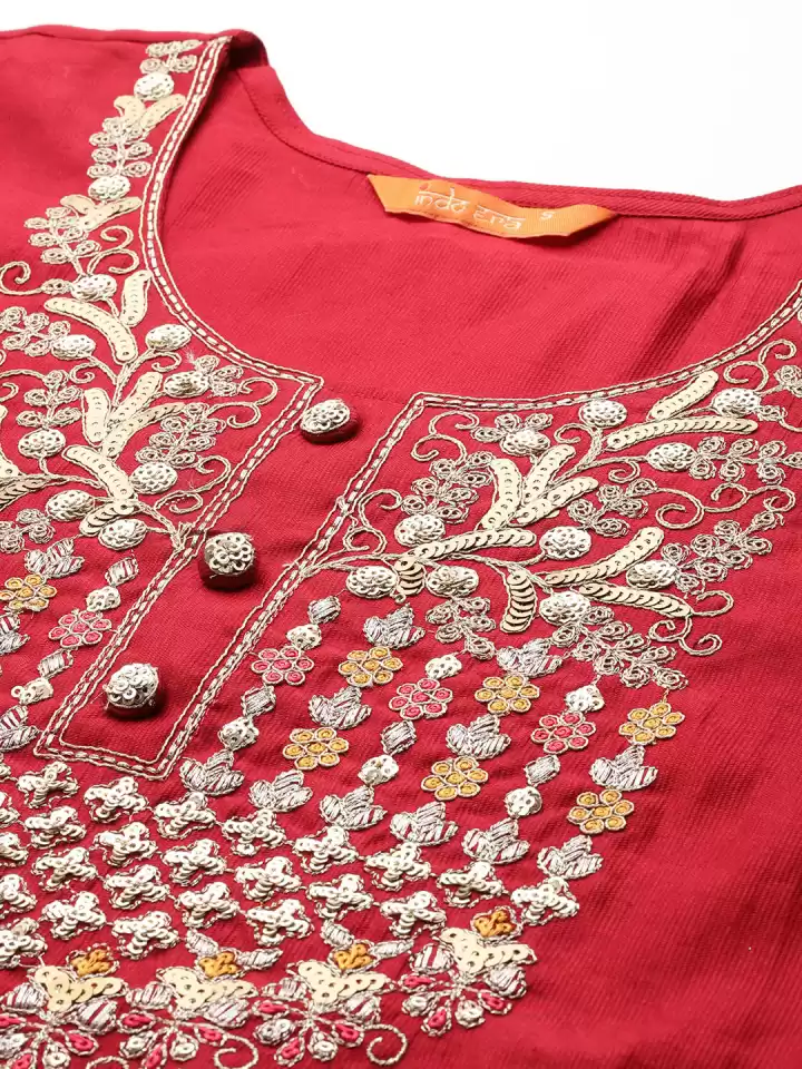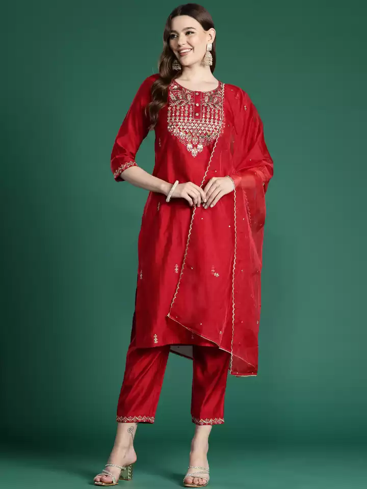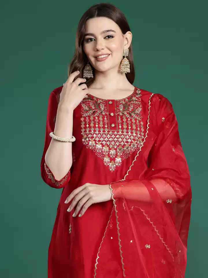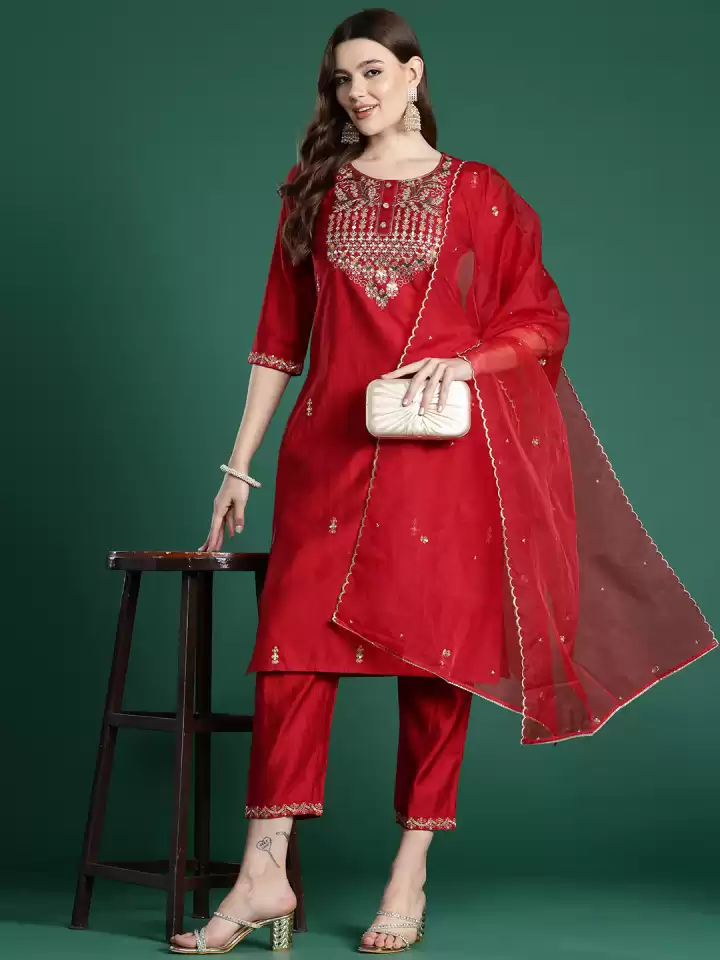 Ethnic Motifs Embroidered Regular Sequinned Liva Kurta with Trousers & Dupatta