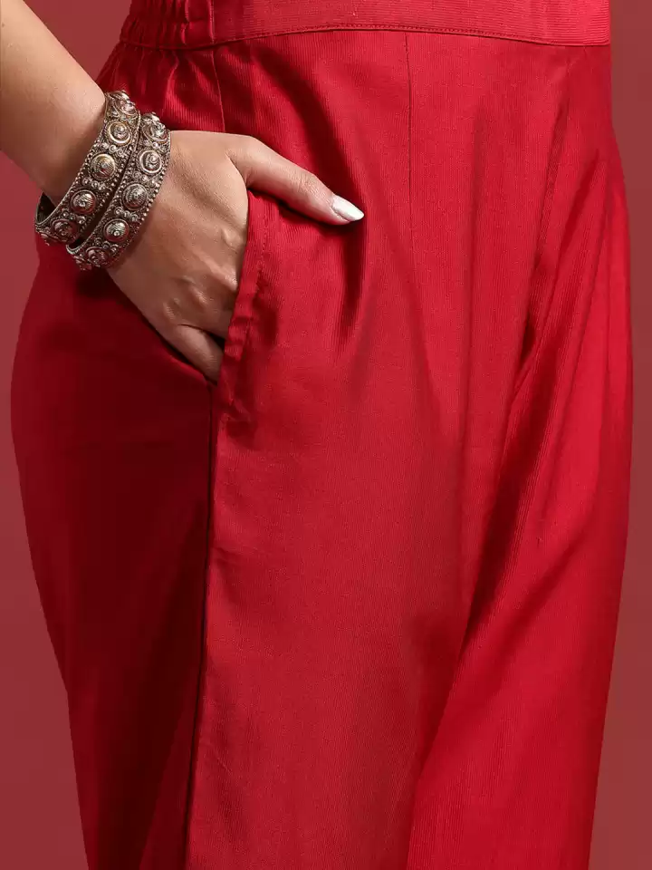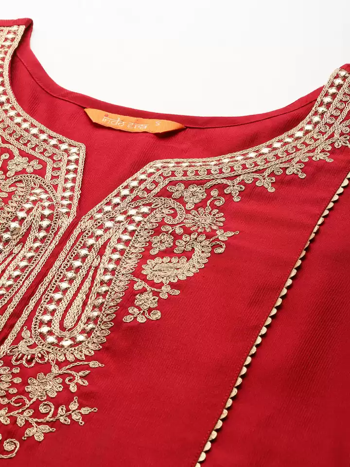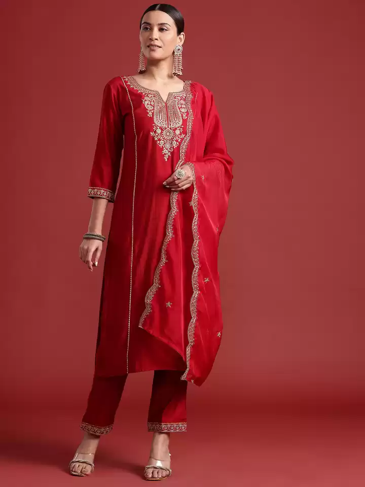 Ethnic Motifs Yoke Design Zari Panelled Liva Kurta With Trousers & Dupatta