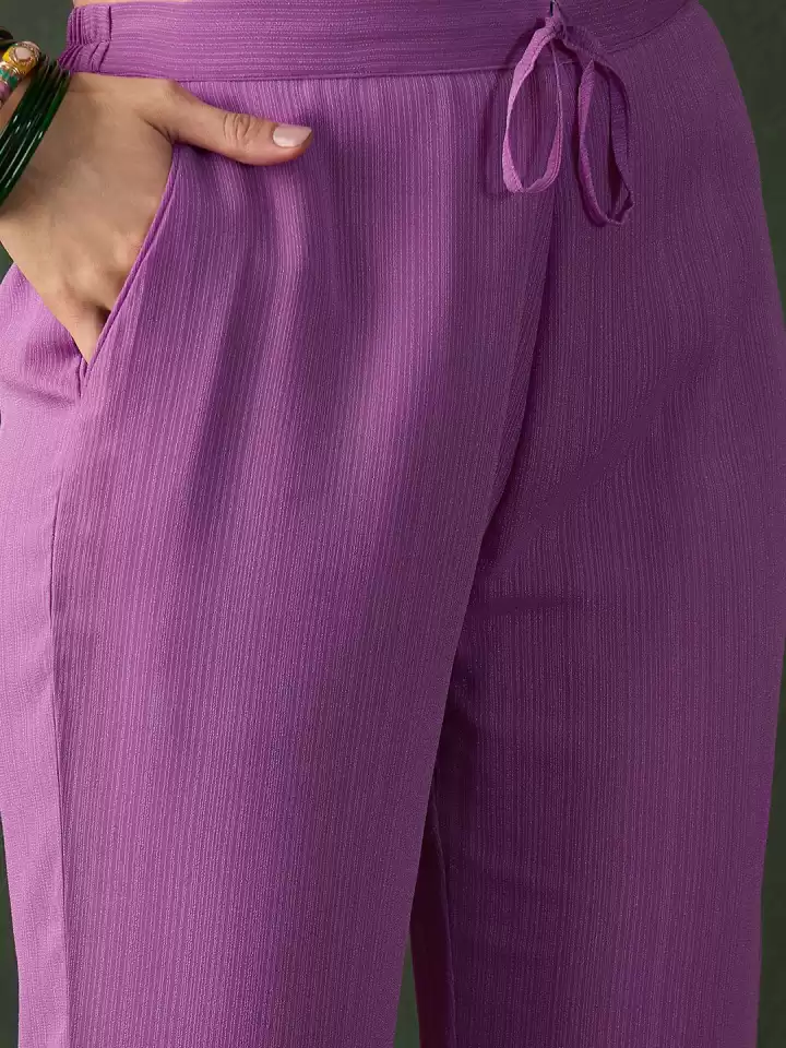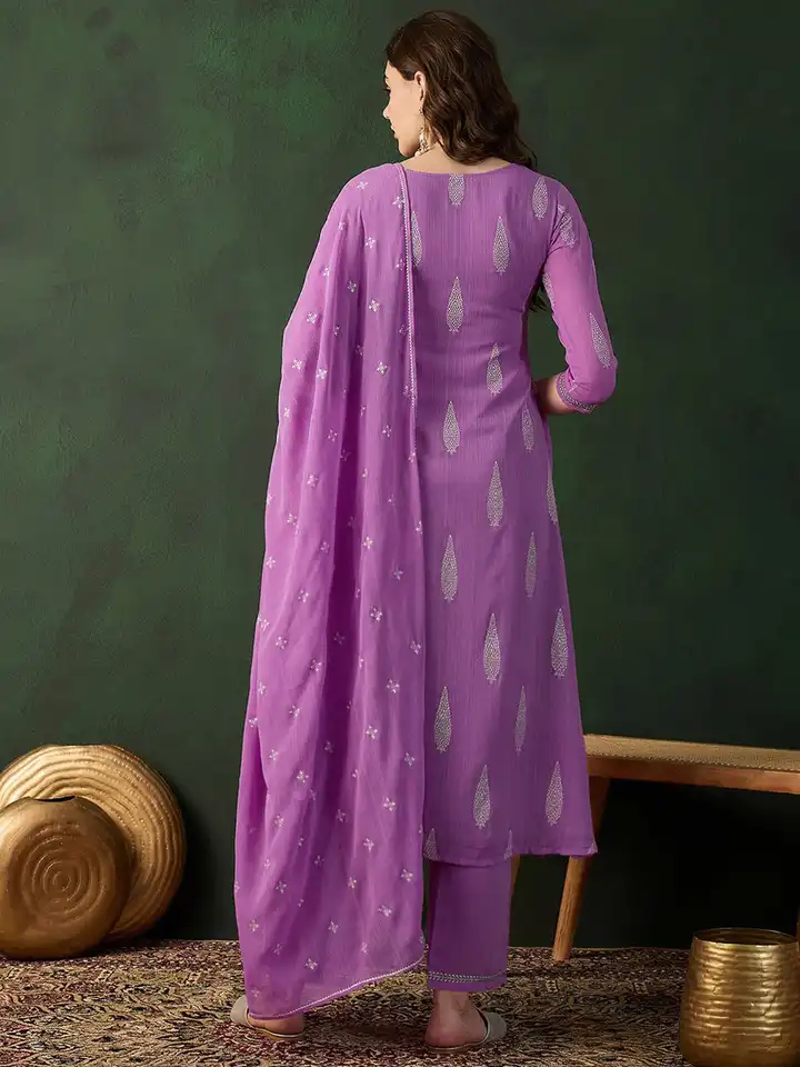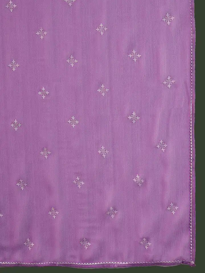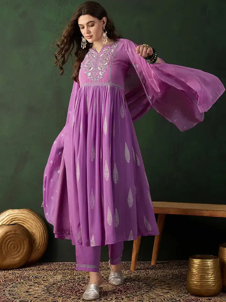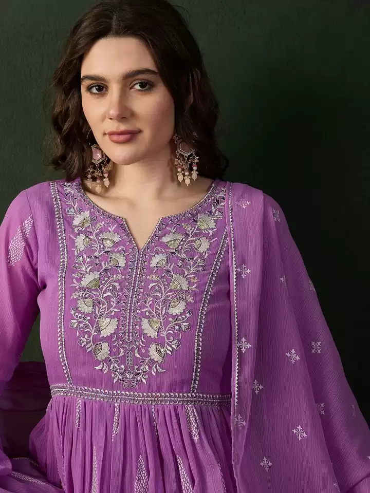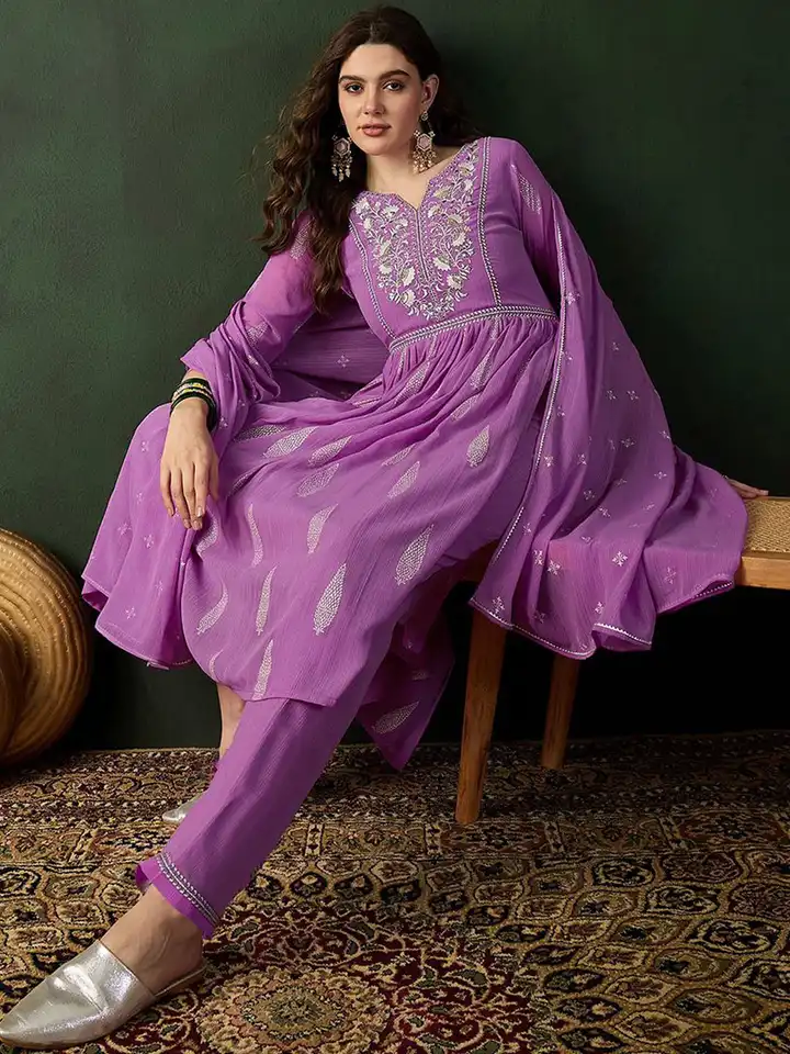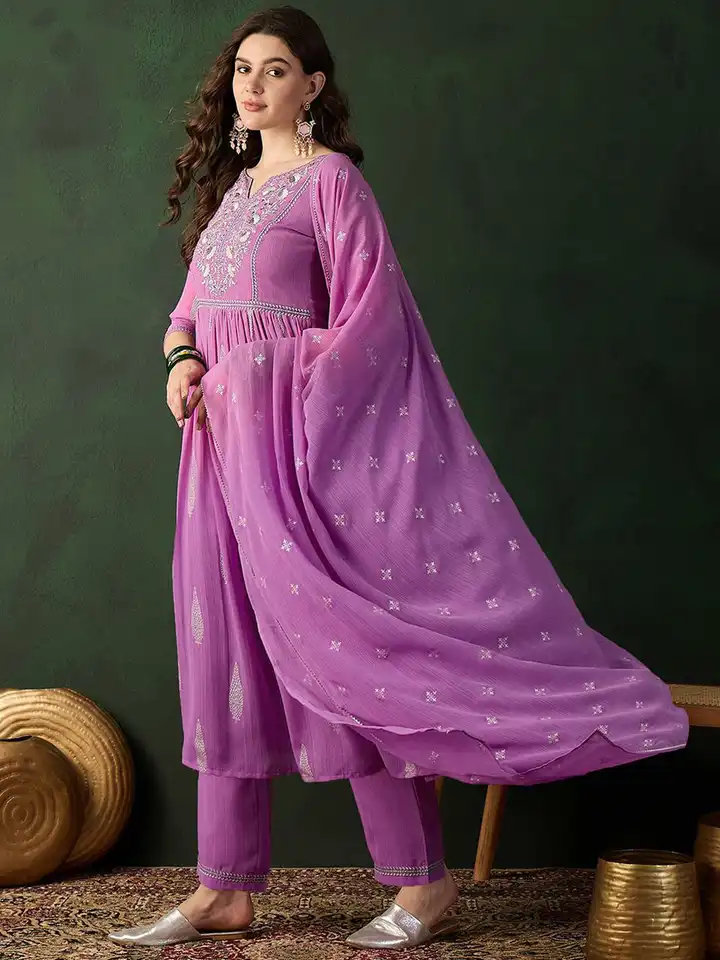 Lavender Printed Notch Neck Georgette A-Line Kurta With Trouser & Dupatta Set