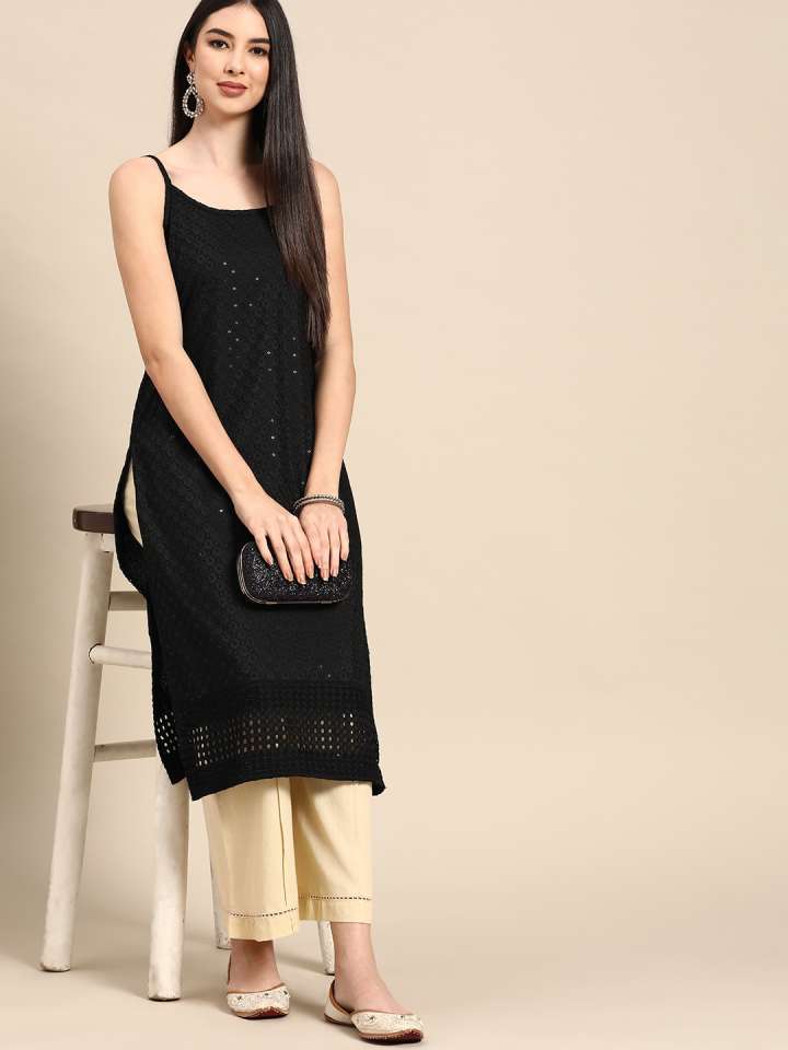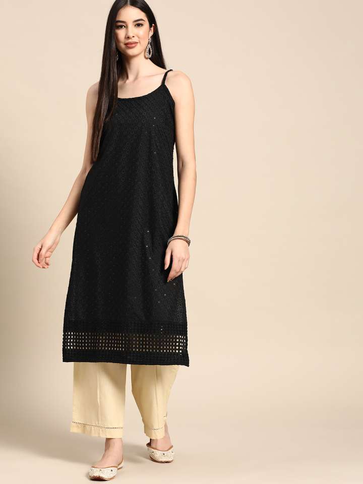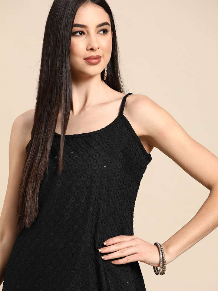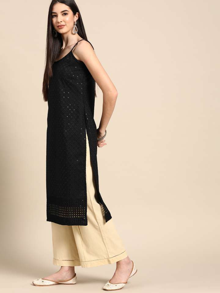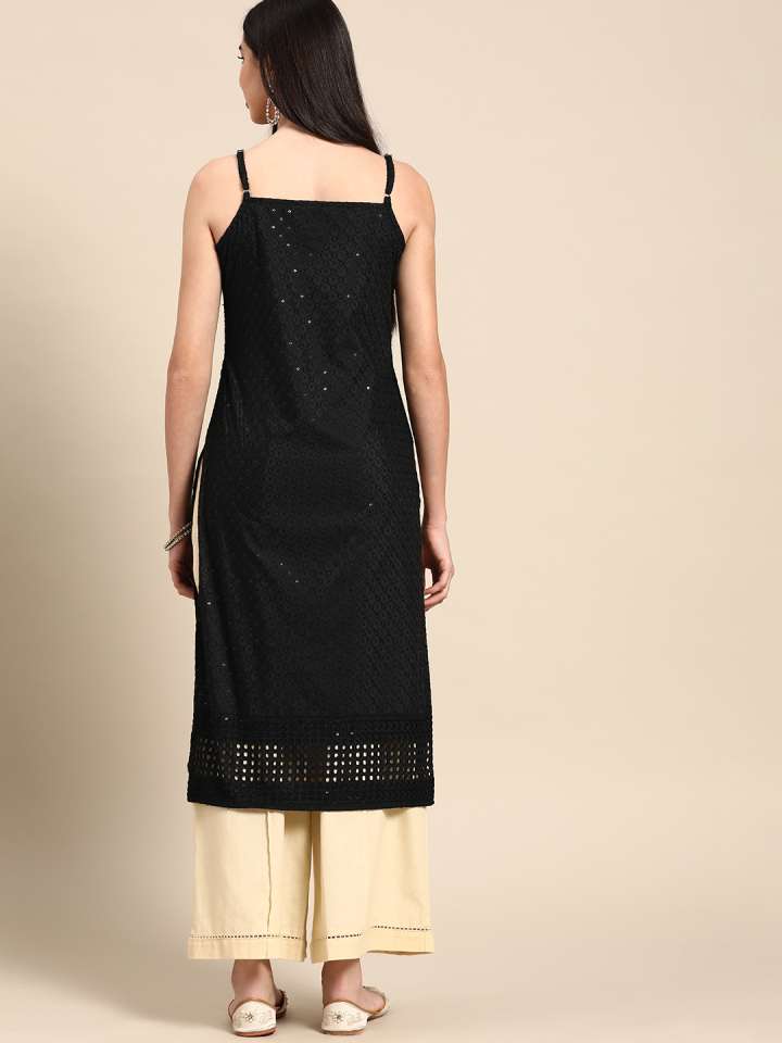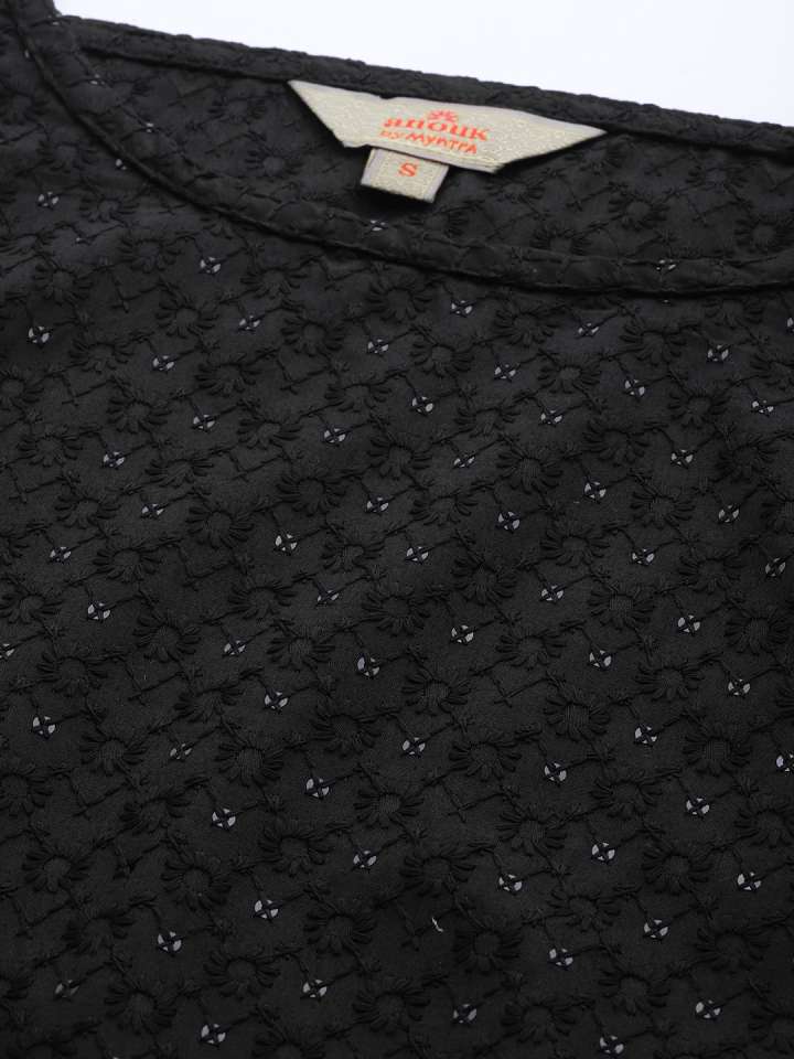Women Black Cotton Ethnic Motifs Schiffli Embroidered Fusion Kurta