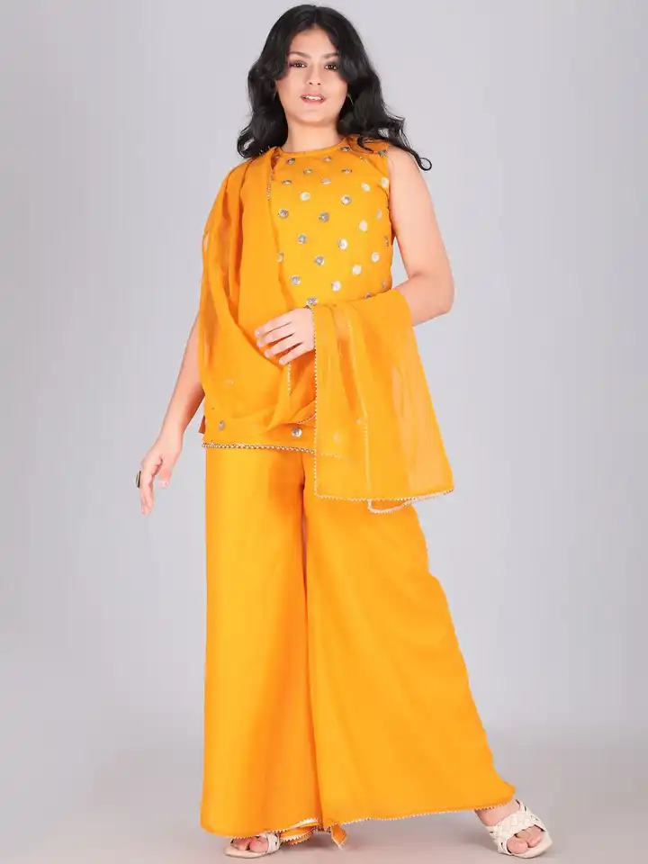 Girls Woven Design Embroidered A-Line Kurti with Palazzos & Dupatta