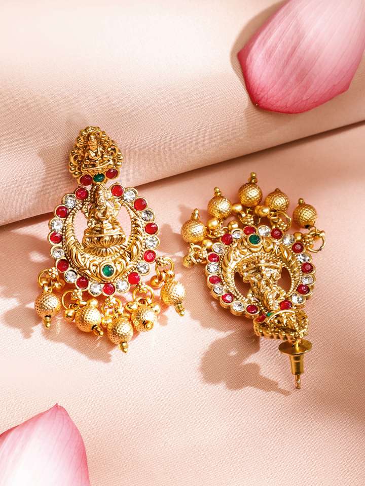 22K Gold Plated Red, Green & White Stone Studded Lakshmi Motif Temple Jewellery Set